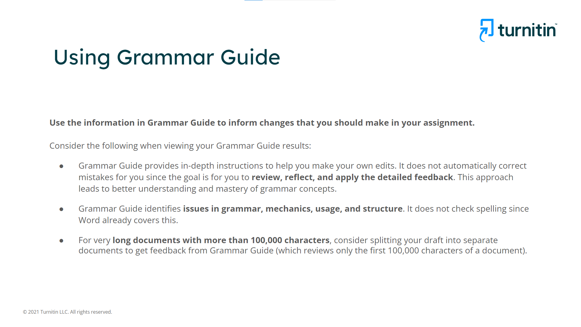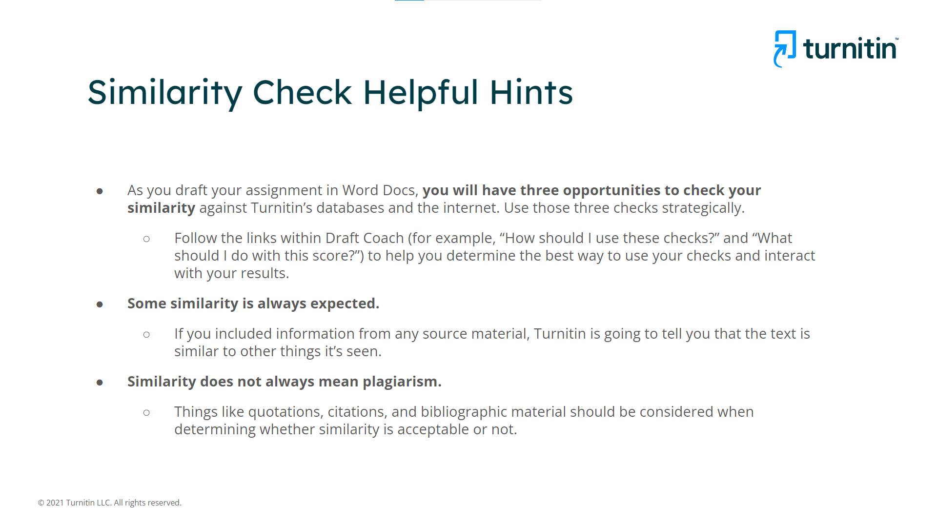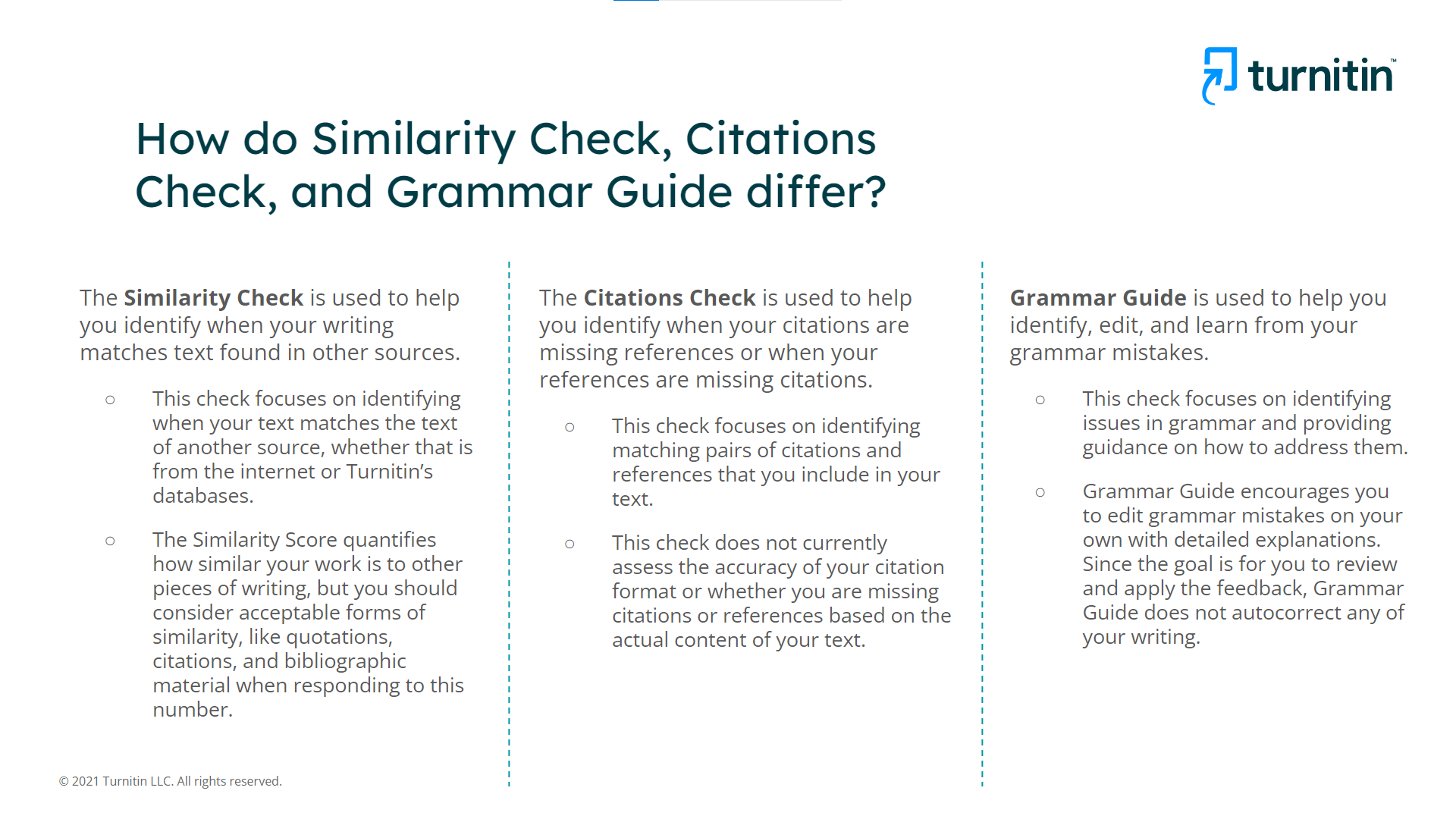 To learn more about the three checks, visit Turnitin’s Website or see below: