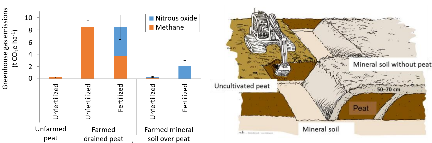 Figure 7. Nitrous oxide and methane emissions from farmed and unfarmed peat soils in western Norway in 2015. Emissions are shown in carbon dioxide equivalents, but carbon dioxide emissions are not included in this figure. Farmed soils were tested with, and without, nitrogen fertilization. Farmed peat was either exposed, or buried with 50-70 cm of mineral soil excavated from below the peat (diagram on right). Adapted from Hansen et al. (2016).