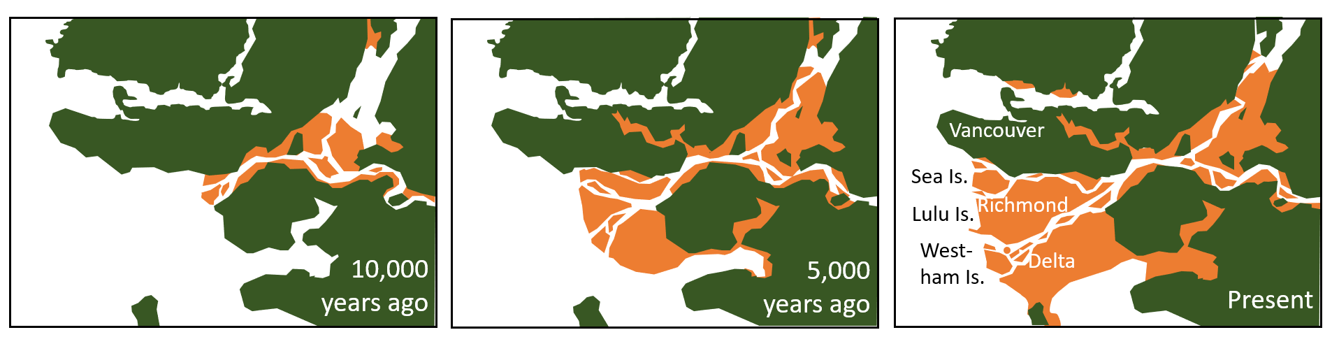 Figure 3. Time series of alluvial deposition (orange) over the past 10,000 years, forming a substantial portion of the current land area of Metro Vancouver, including most of present-day Richmond and Delta (Clague, 1998). Most of the peatlands near the mouth of the Fraser River occur over these alluvial deposits.