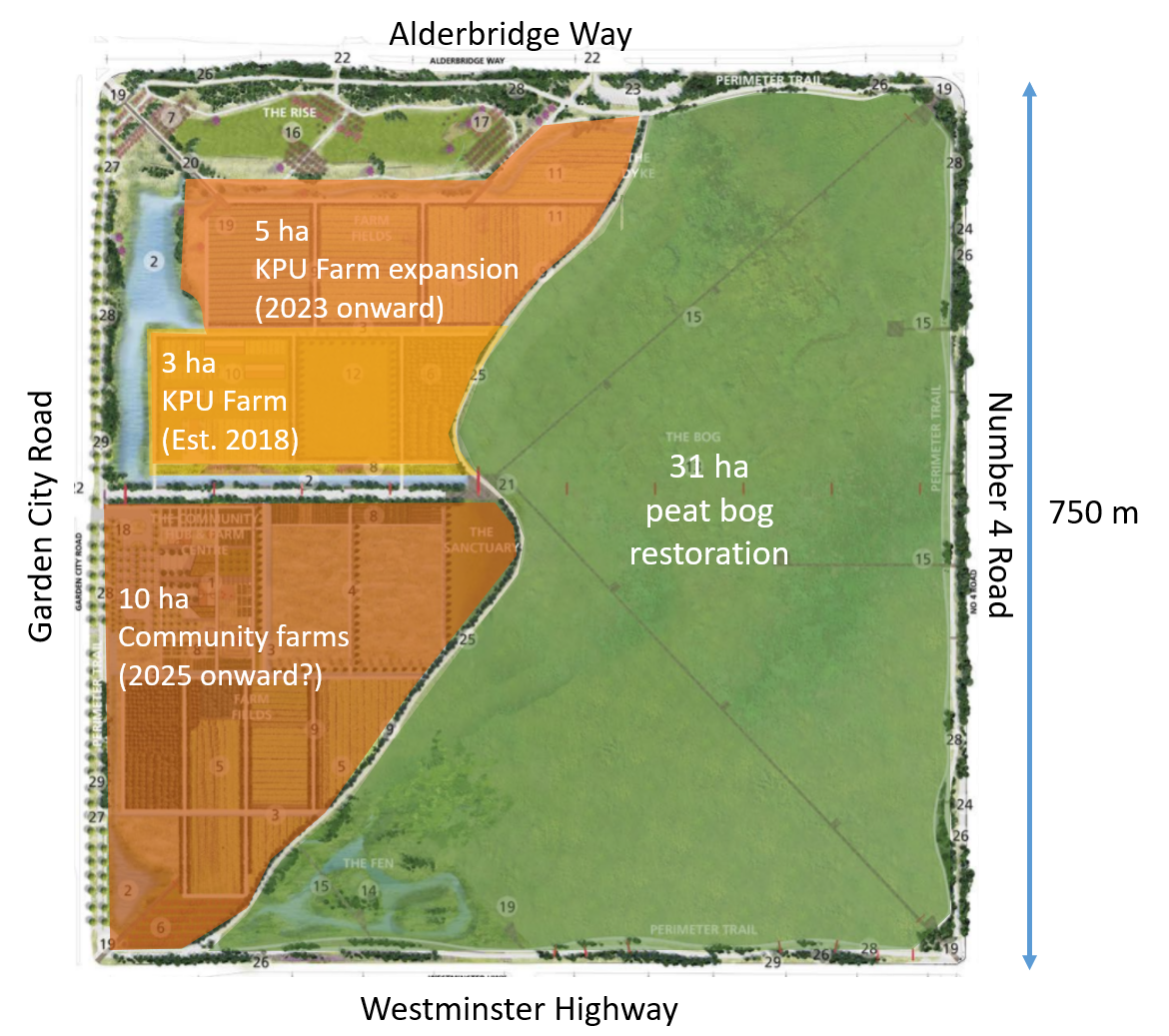 - The KPU Farm on Richmond’s Garden City Lands has been operating on 70 cm of mineral soil fill placed above the native peat in 2017. European research suggests that this approach conserves peat, avoids subsidence, and reduces greenhouse gas emissions.