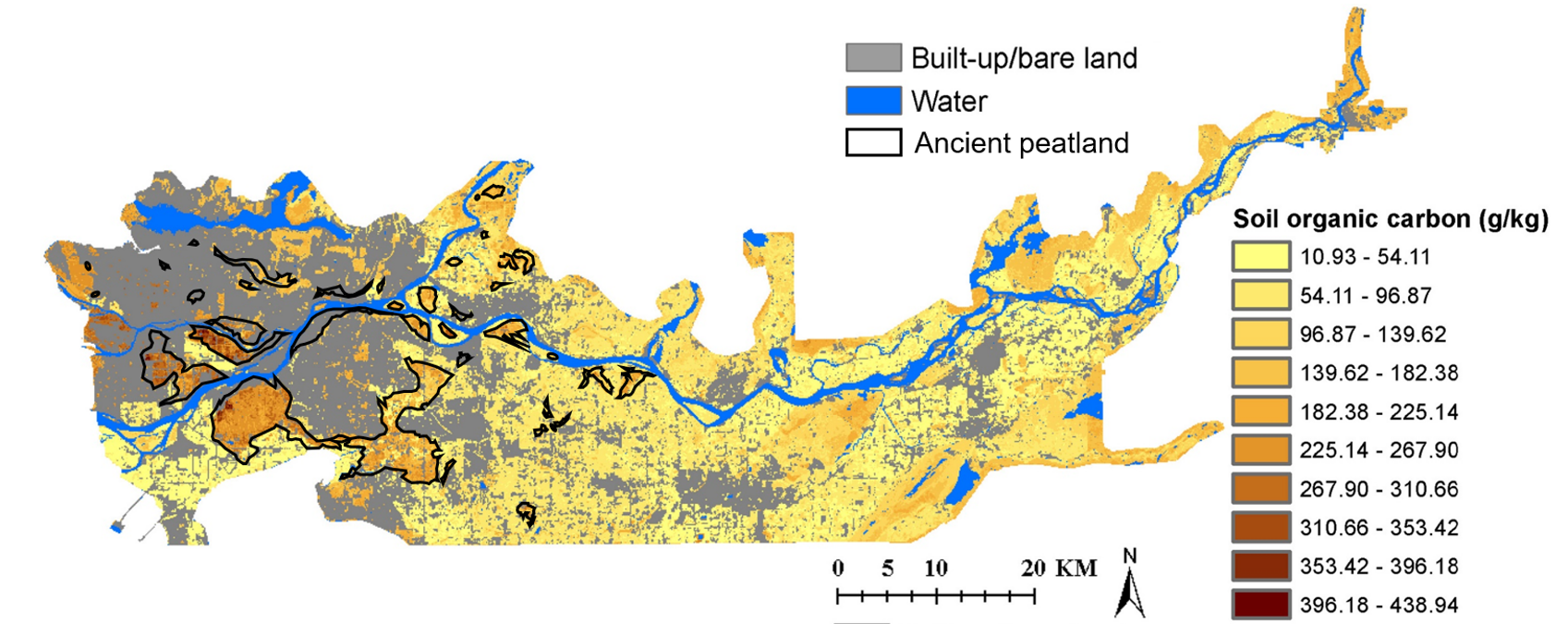 Figure 2. Soil organic carbon concentration in the lower Fraser Valley, with ancient peatlands outlined in black (adapted from Paul et al., 2020; Turner et al., 1997).
