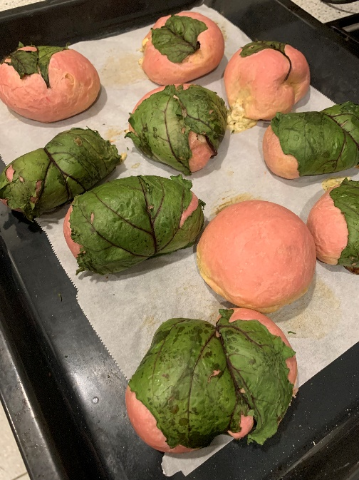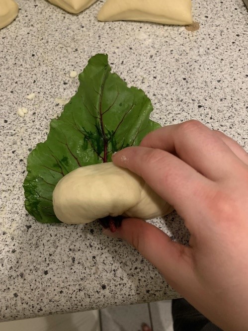 - Wrap the dough in a beet leaf and place on a lined baking sheet. Cover, and let proof for another 45 minutes in a warm location. You’ll want to start heating up your oven to 350°F somewhere within this time frame, depending on how long it takes.