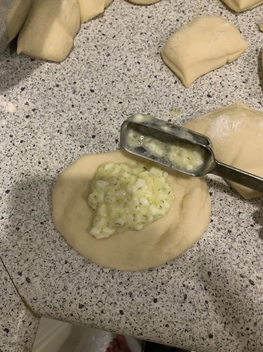 - Mix the cottage cheese with dill and add a pinch of salt if desired. Wash and lightly dry the beet leaves, and remove the long, fibrous stems (these can be added to soup). Take the dough out of its bowl and onto a lightly floured counter. With a knife, separate the dough into 12 equally-sized pieces. Take a piece, round out the shape, then flatten it. Put a tablespoon of the cottage cheese in the centre and carefully close up the filing, either by folding the bun into a log-shape or into more of a sphere (do whatever works for you). You’ll probably want to stretch the dough out a bit more than what I’ve done in the photo below.