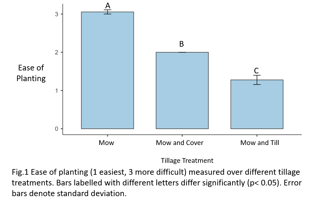 The plots that were tilled were significantly easier to plant (p0.05) than either no-till treatment. The mow and cover plots were easier to plant than the plots that were mowed but not covered.