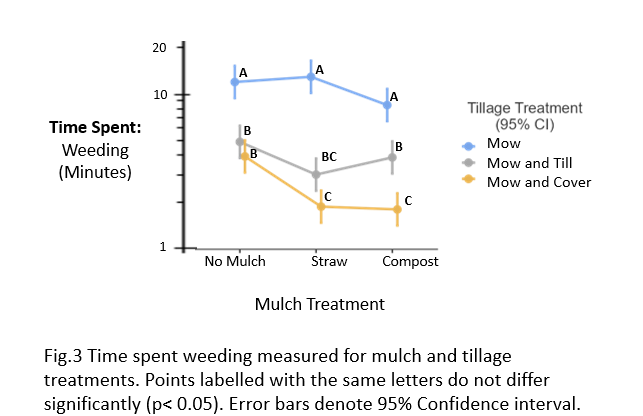 There was significantly (P0.05) less time spent on the mow and cover plots compared to both other treatments, and less time spent on the tilled plots compared to the mowed plots. Additionally, there was significantly (P0.05) less time weeding on the sub-plots that were mulched with either compost or straw as compared to the plots that weren’t mulched. There were also many significant interactions between mulch and tillage treatments. All mowed treatments no matter their mulch took the longest to weed. Mowed and covered treatments mulched with compost or straw took the least amount of time to weed, and tilled treatments mulched with straw took longer than mowed and covered crop with mulch, but not significantly longer amount of time to weed (Fig. 3).