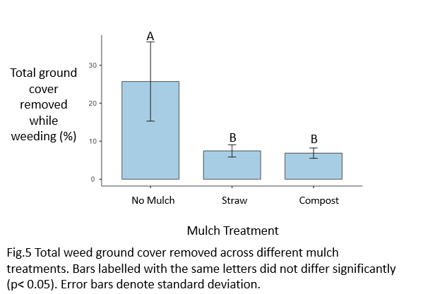 There were significantly more weeds present in the plots without mulch at the end of the season as compared to plots with either straw mulch or compost mulch.