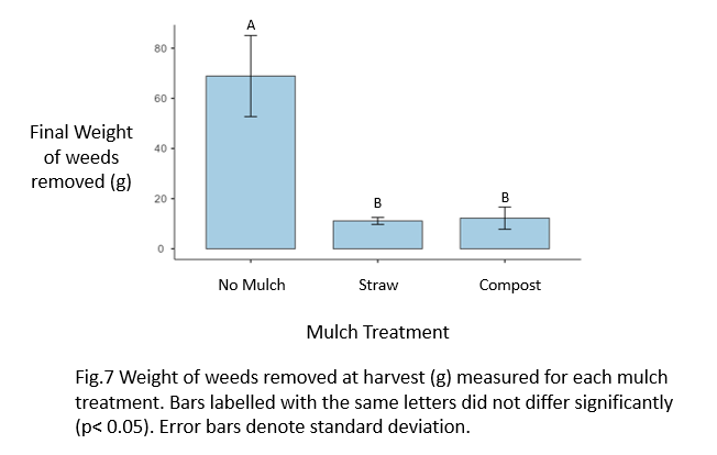 - Hypothesis 2: Mulching can be used to suppress weeds and reduce weed pressure and increase crop yield in vegetable crop production. This hypothesis is partially accepted, mulching was shown to help suppress weeds and reduce weed pressure however had no significant impact on crop yield.
