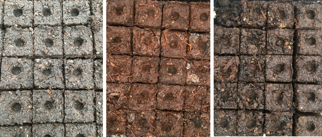 Figure 1. Soil blocks made from peat (left), fresh spent mushroom compost (centre), and aged spent mushroom compost (right)