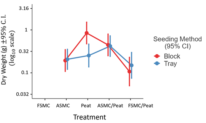 An interaction was detected between growing medium and seeding method (p = 0.005)(Figure 6). Plants grown in peat soil blocks were larger than those grown in peat in plastic plug trays. Seeding method did not affect seedling growth in the other media.
