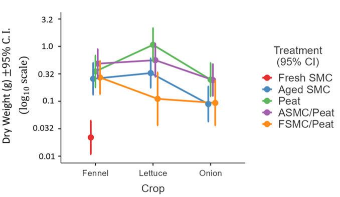 Fennel was the only crop to survive in the fresh SMC treatment (Figure 7), so the interaction between crop and growing medium could not be tested. Lettuce appeared to be most sensitive to growing media effects.