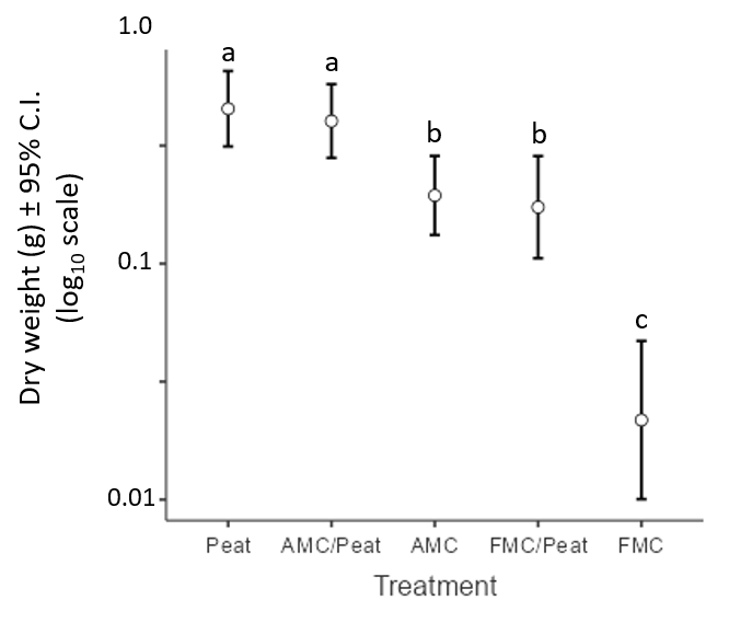 Figure 4. Plant dry weight by growing medium six weeks after seeding. Seedlings were grown in pure peat (Peat), aged mushroom compost (AMC), fresh mushroom compost (FMC), or a 1:1 blend of peat and aged or fresh mushroom compost (AMC/Peat or FMC/Peat, respectively). Error bars denote the 95% confidence interval around each mean. Means labeled with the same letter do not differ significantly (Bonferroni test, α = 0.05).