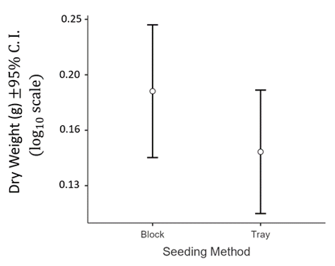 Figure 5. Plant dry weight by seeding method six weeks after seeding. Seedlings were grown in soil blocks and horticultural plastic. Error bars denote the 95% confidence interval around each mean.