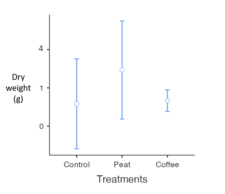 Figure 2. Dry weight of Lion’s Mane mushroom by growth substrate. Error bars denote 95% confidence interval around mean of square root transformed values (n=3) to satisfy assumptions of normality and homogeneity of variance. Note non-linear y-axis scale due to back transformation. No significant differences were detected between means.