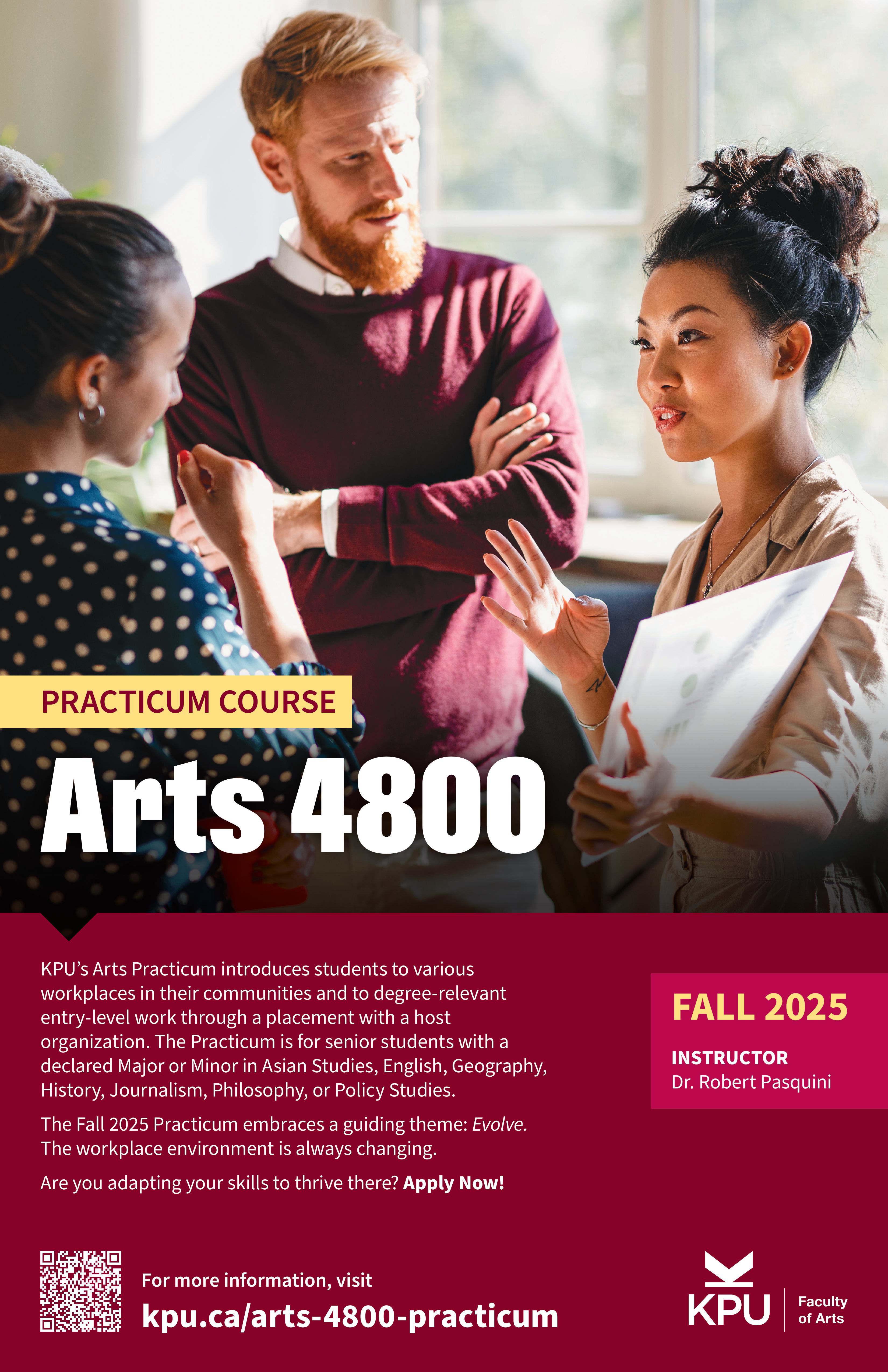 "I’d recommend all Faculty of Arts students take the ARTS 4800 practicum course before graduation. Not only did this class gear me with the skills and knowledge necessary to see success post-graduation, like building an eye-catching resume and cover letter, but allowed me to gain real work experience in my field of study, elevating my resume. This behind-the-scenes look at a potential future employer was an invaluable learning experience as I now know what to expect in the working field but also what is expected of me. Arts 4800 is the perfect final stepping stone to wrap up and complete your credentials at KPU."