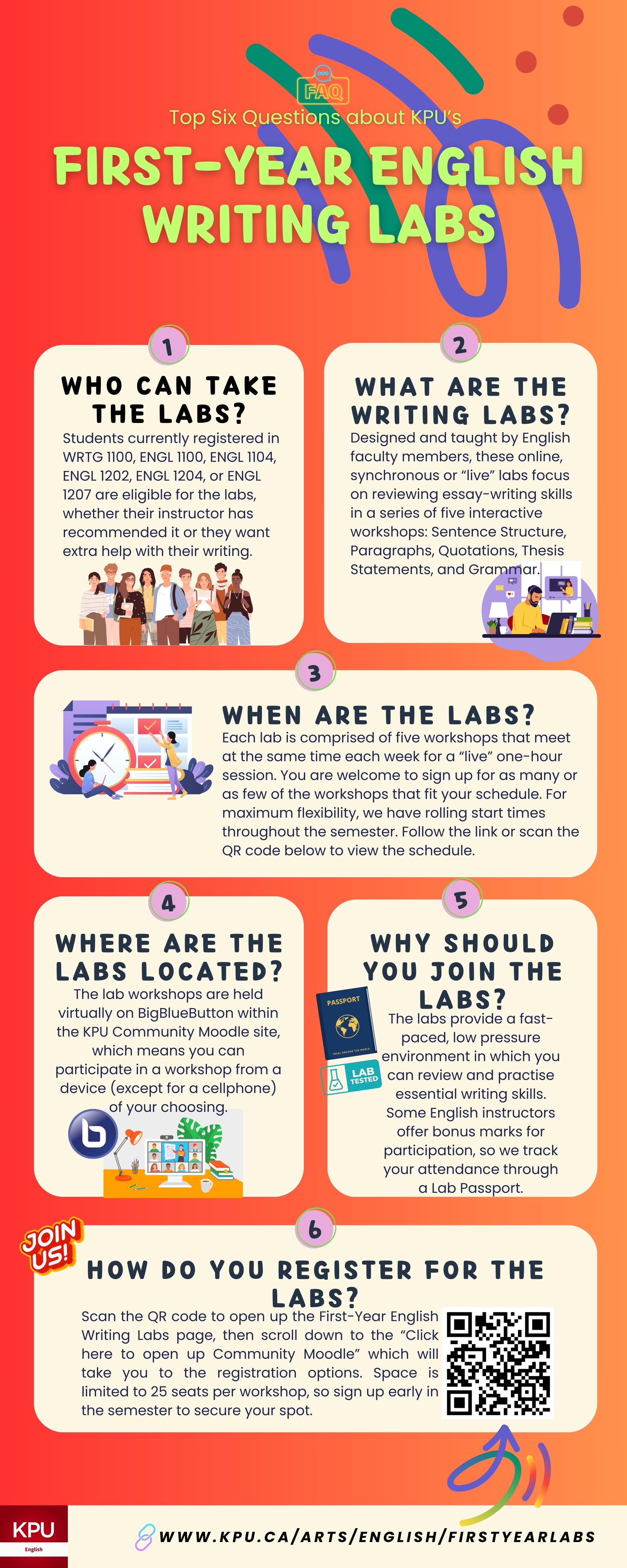 Each lab covers five topics in five workshops over five consecutive weeks. All digital materials are provided and each workshop covers a lesson on the basic components of university writing. Every lab offers the same five workshops: Sentence Structure, Paragraphs, Using Quotations, Thesis Development, and Grammar.