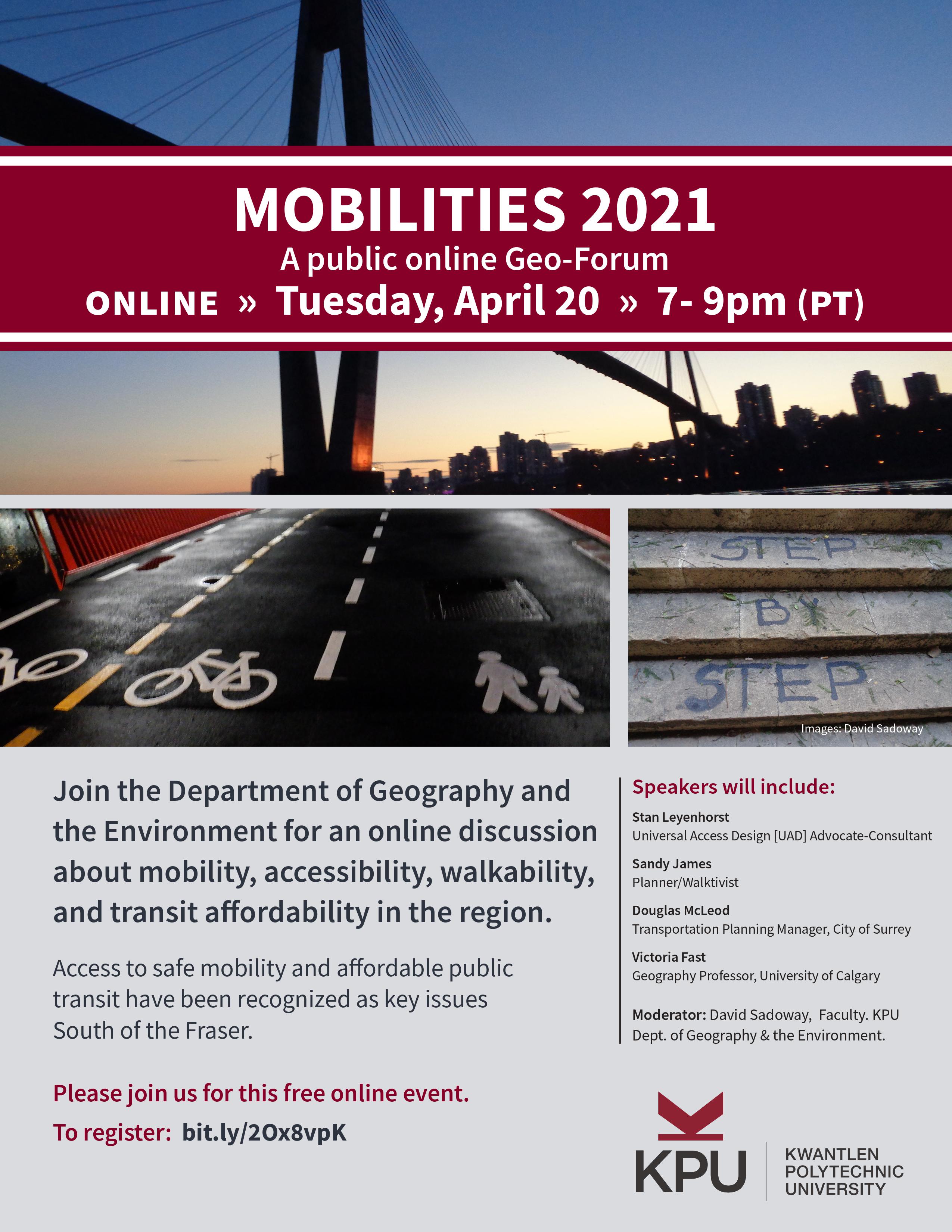 Panelists have just been announced for the MOBILITIES 2021, a free online webinar on April 20th. Kwantlen’s Department of Geography and the Environment invites you to this public geo-forum about mobility, universal accessibility, walkability and transit affordability South of the Fraser River. Confirmed panelists include two TED Talk speakers, Stan Leyenhorst (Universal Access Design, Lead Consultant) and Planner Sandy James (WalkMetroVan). Also joining us will be urban geography expert Dr. Victoria Fast (University of Calgary) and City of Surrey Transport Planning Manager, Douglas McLeod, who will preview the city’s new Transportation Plan. Our panel will be welcomed by Kwantlen First Nations Elder in Residence, Lekeyten.