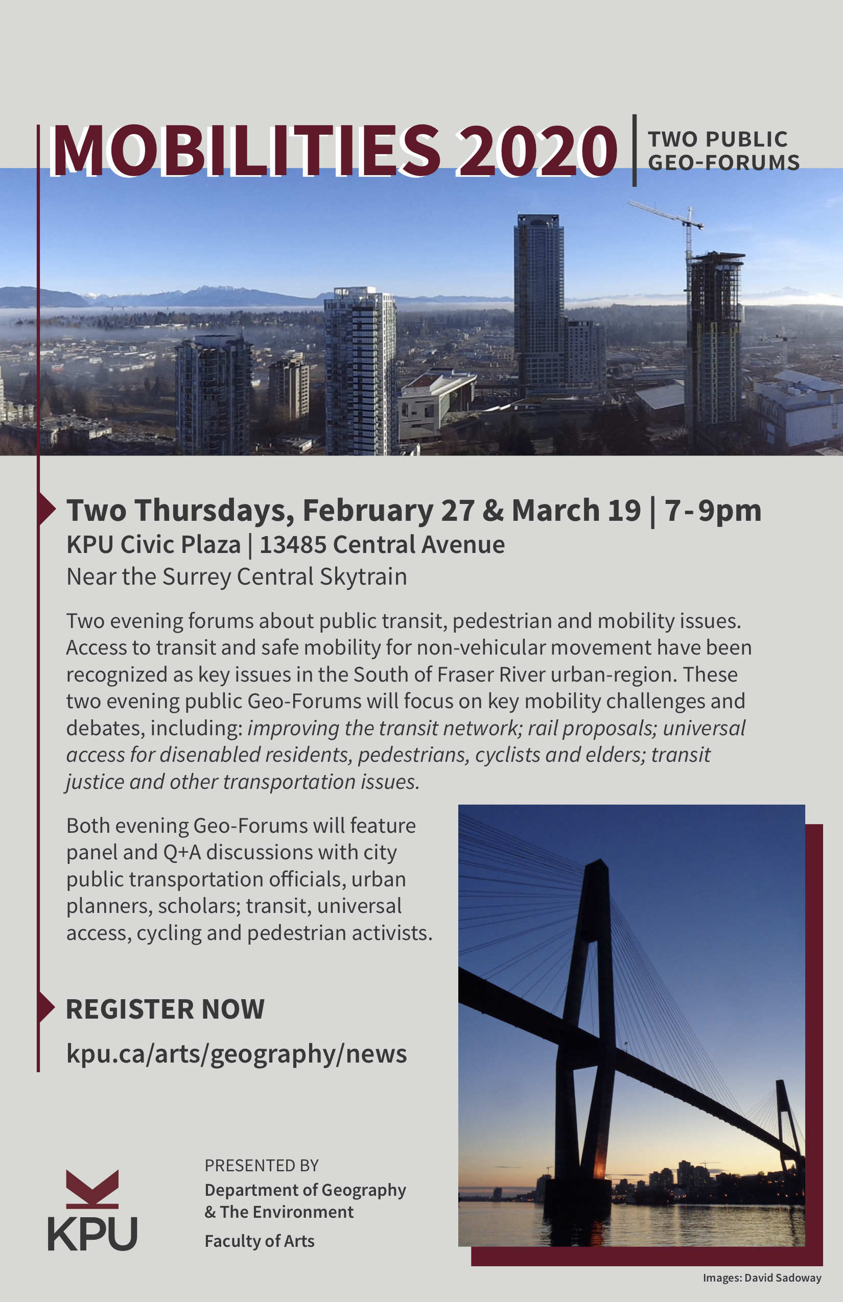 These evening Geo-Forums are on Thursday, Feb.27th (7-9pm) and Thursday, March 19th (7-9pm) at KPUs new Civic Plaza Campus (just North of the Surrey Central Skytrain Station). Both evening KPU Geo-Forums will feature panel and Q+A discussions with city public transportation officials, urban planners, scholars, transit, universal access, cycling and pedestrian activists.