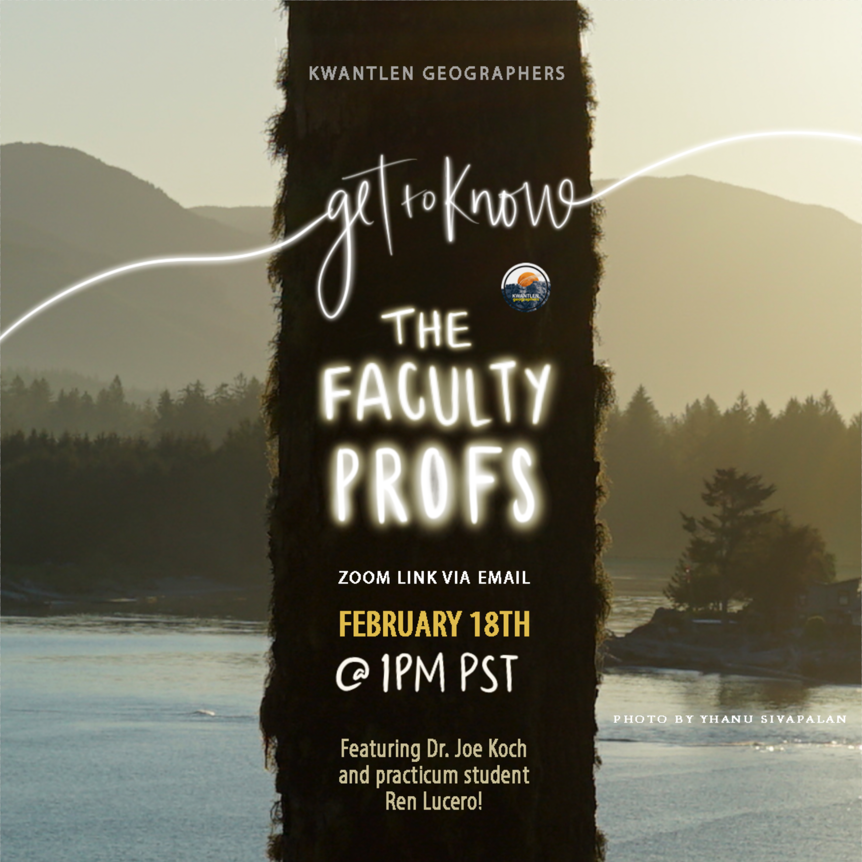 We hosted a virtual Get to Know the Faculty Profs event, featuring Dr. Joe Koch and practicum student Ren Lucero! Attendees were able to learn about Dr. Koch's fascinating academic and professional journey as a geographer and hear about his adventurous field studies abroad. Ren presented on her experience doing a practicum with the Langley Environment Partners Society. Both sessions were followed by a Q&A from the students.