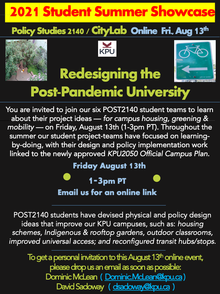 This past Summer 2021 our six Policy Studies/POST2140 student teams (each with 3-5 students) have been actively working on preliminary thought experiments and provactions that focus on housing, greening, and mobility projects on or near KPU Campuses. Students have dovetailed these ideas with the recently approved KPU2050 Official Campus Plan. This Friday's POST 2140 Summer Showcase will provide you with a sampling of these amazingly diverse physical and polcy designs.