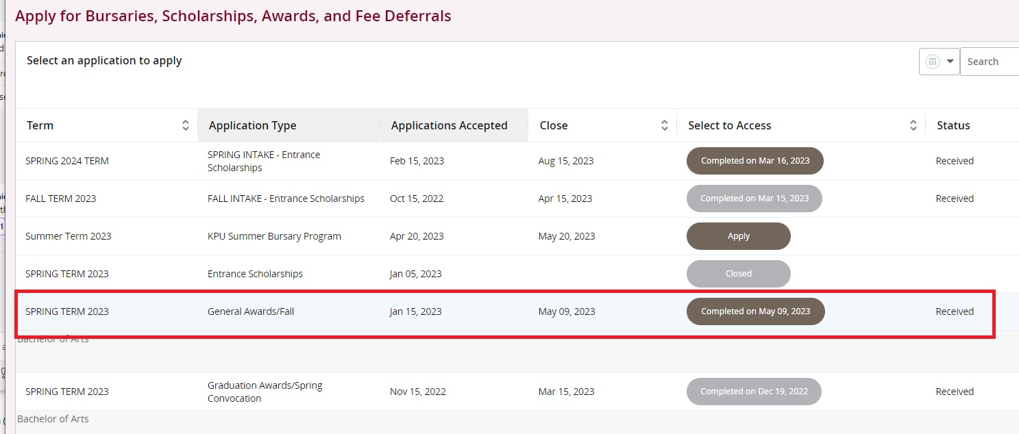- If submitted successfully, STATUS will change to Received. You may return and make changes to your application as long as the application period is open. Just ensure you click “Yes” to the Terms and Conditions on the Personal Declaration page to ensure your changes are saved and received.