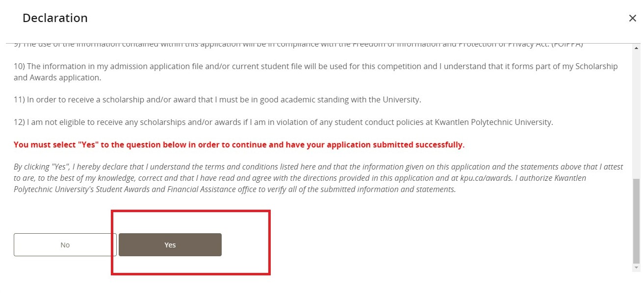 - IMPORTANT: When you get to the last page, click “Yes” to the Terms and Conditions on the Personal Declaration page to ensure successful submission of your application.