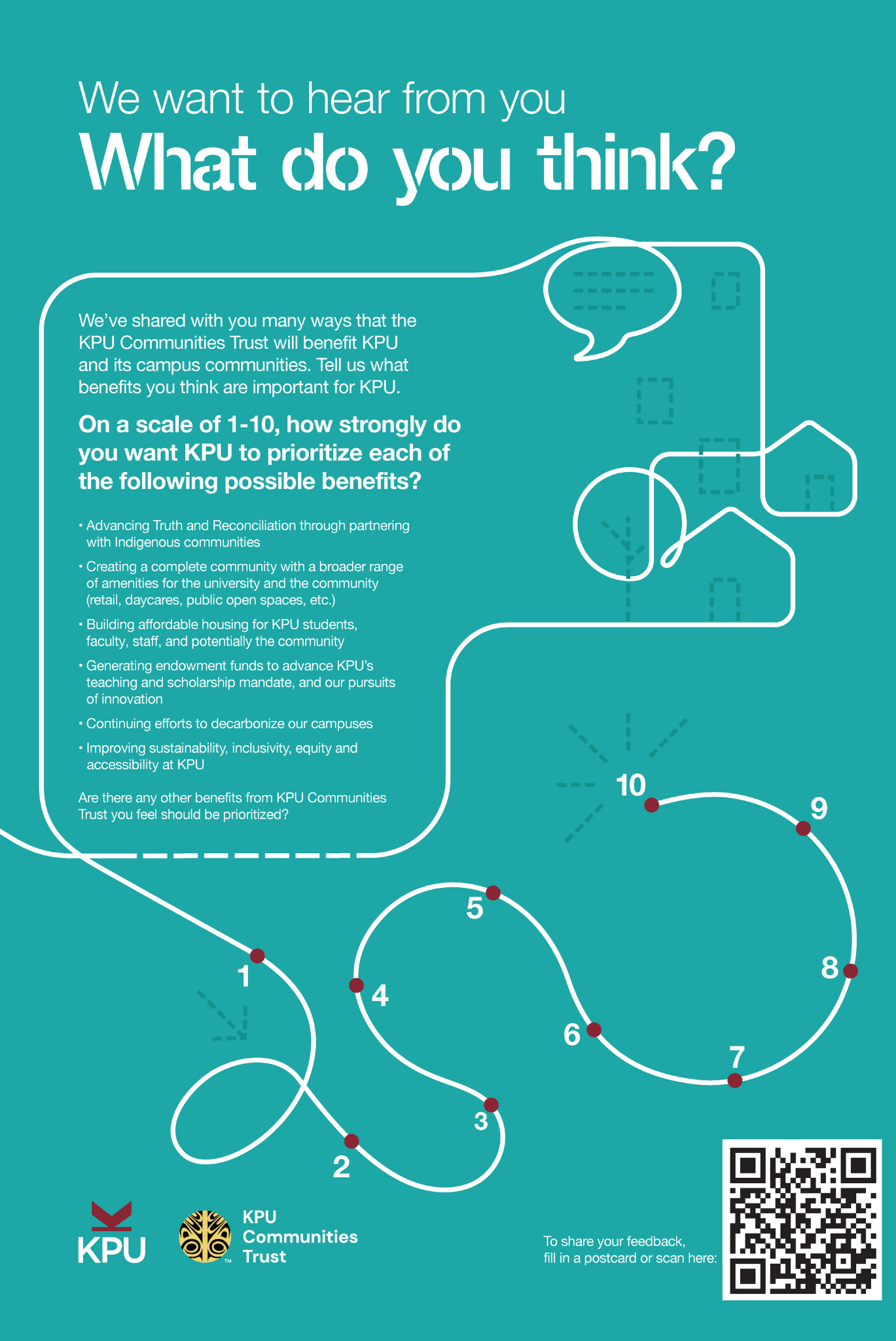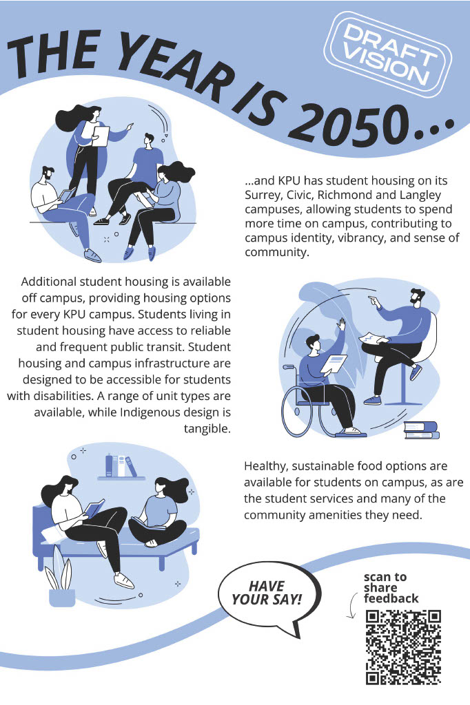 Throughout January 2024, KPU’s Campus and Community Planning team visited each campus to seek input on a range of exciting projects including future student housing, KPU Communities Trust, and sustainable transportation at KPU. We would like to thank the students, faculty, and staff members who took the time to share their ideas, priorities, and experiences during these engagement activities.