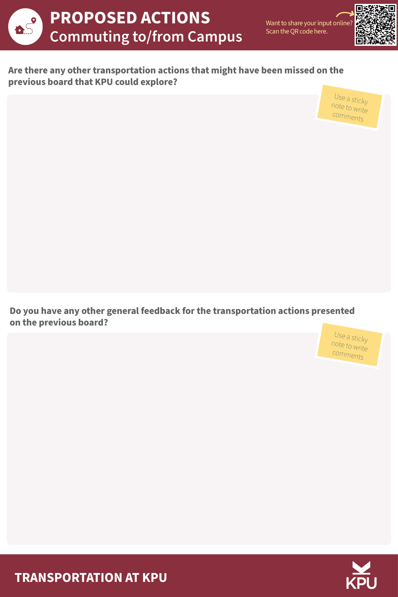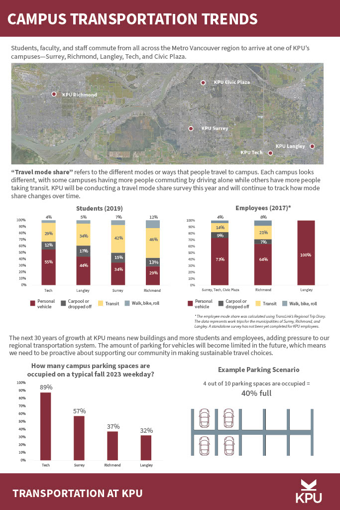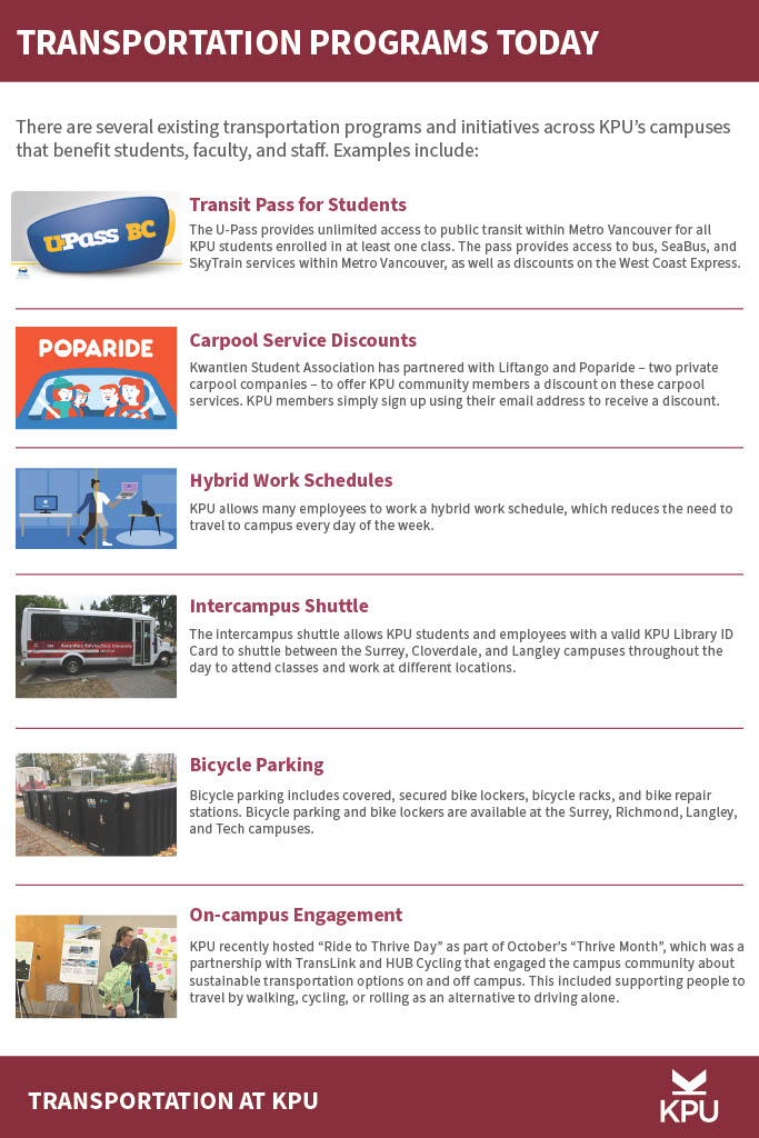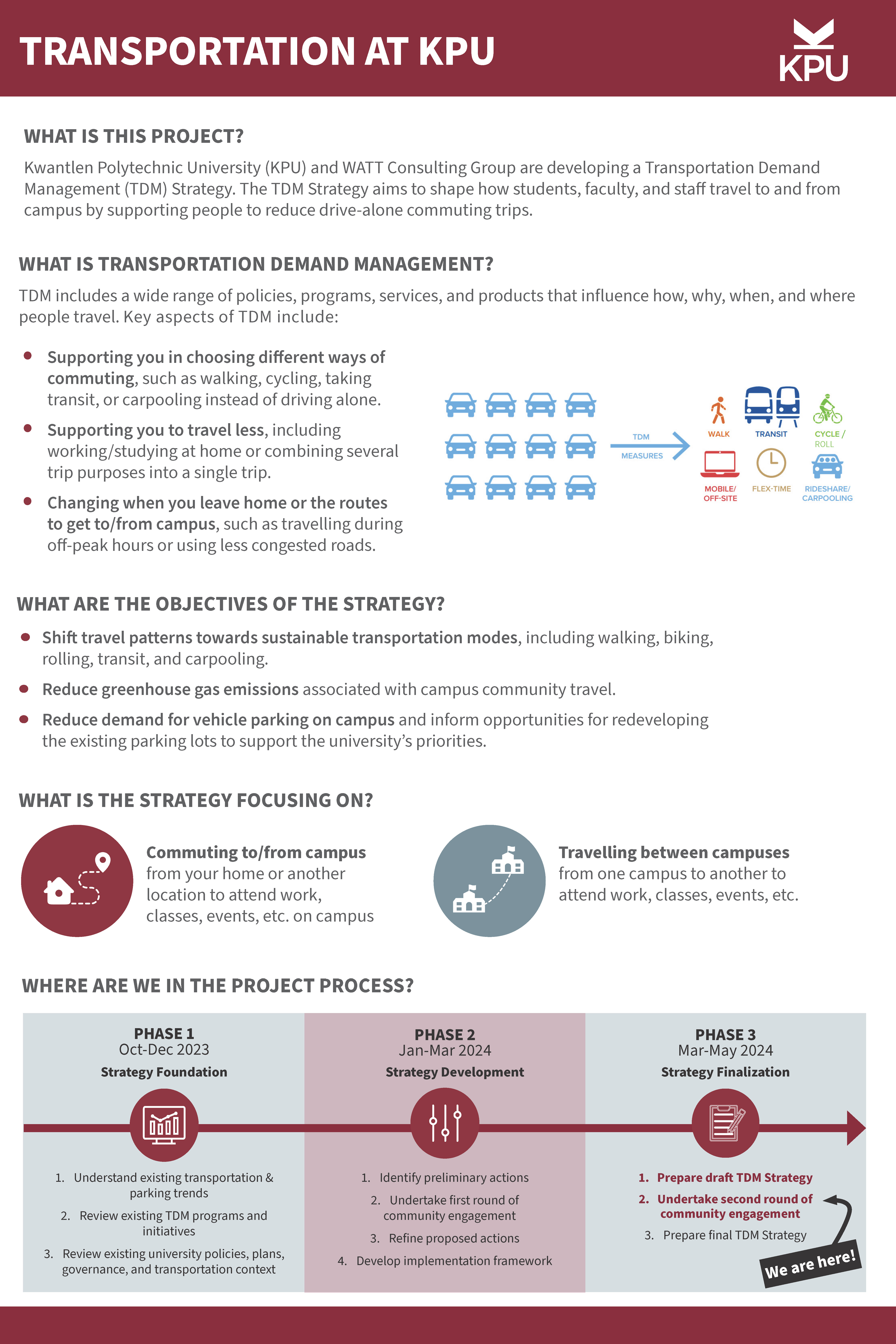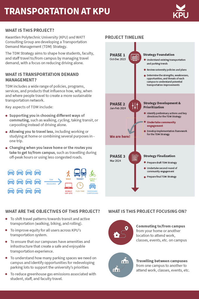 Throughout April 2024, KPU's Campus and Community Planning team visited each campus to seek input on the development on KPU's first Transportation Demand Management (TDM) Strategy. The TDM Strategy aims to shape how students, faculty, and staff travel to and from campus by supporting people to reduce drive-alone commuting trips.