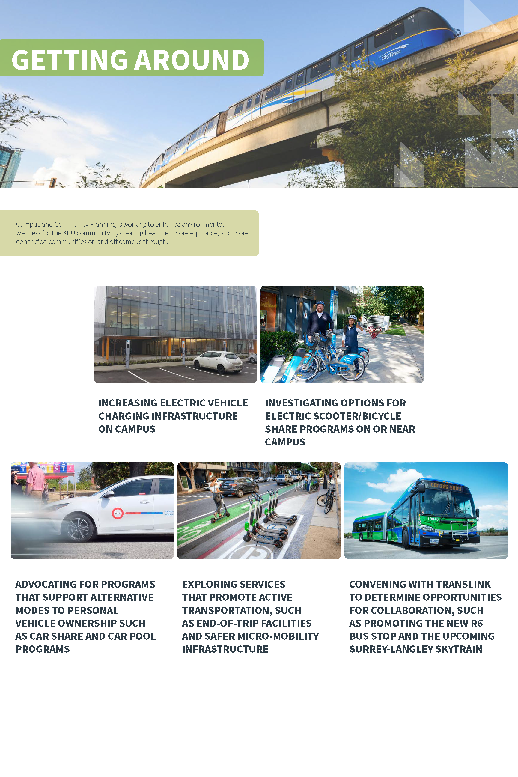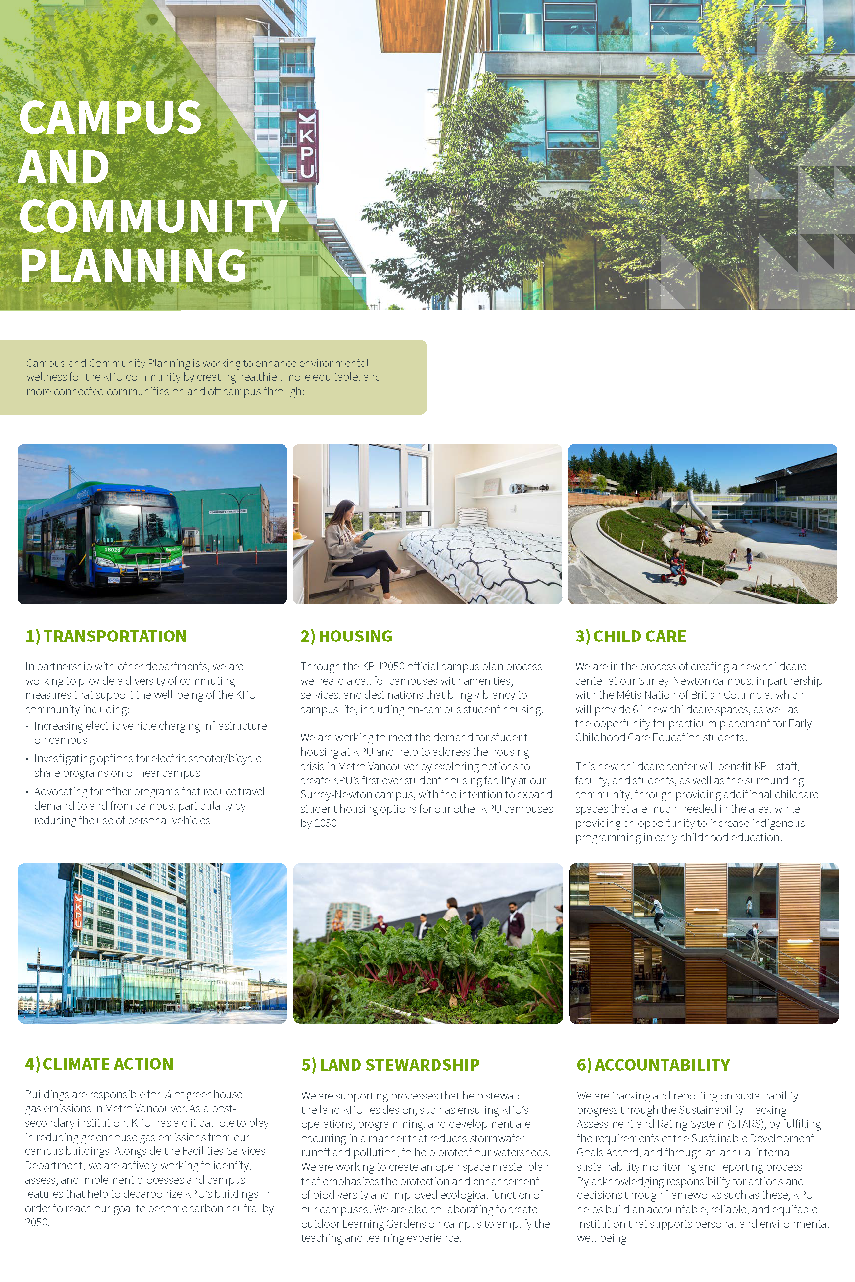 Campus and Community Planning is responsible for KPU’s sustainable development and design efforts. The KPU2050 Official Campus Plan Sustainability Framework provides a greenhouse gas emissions reduction strategy, timeline and targets, as well as a holistic framework for sustainability advancement.
