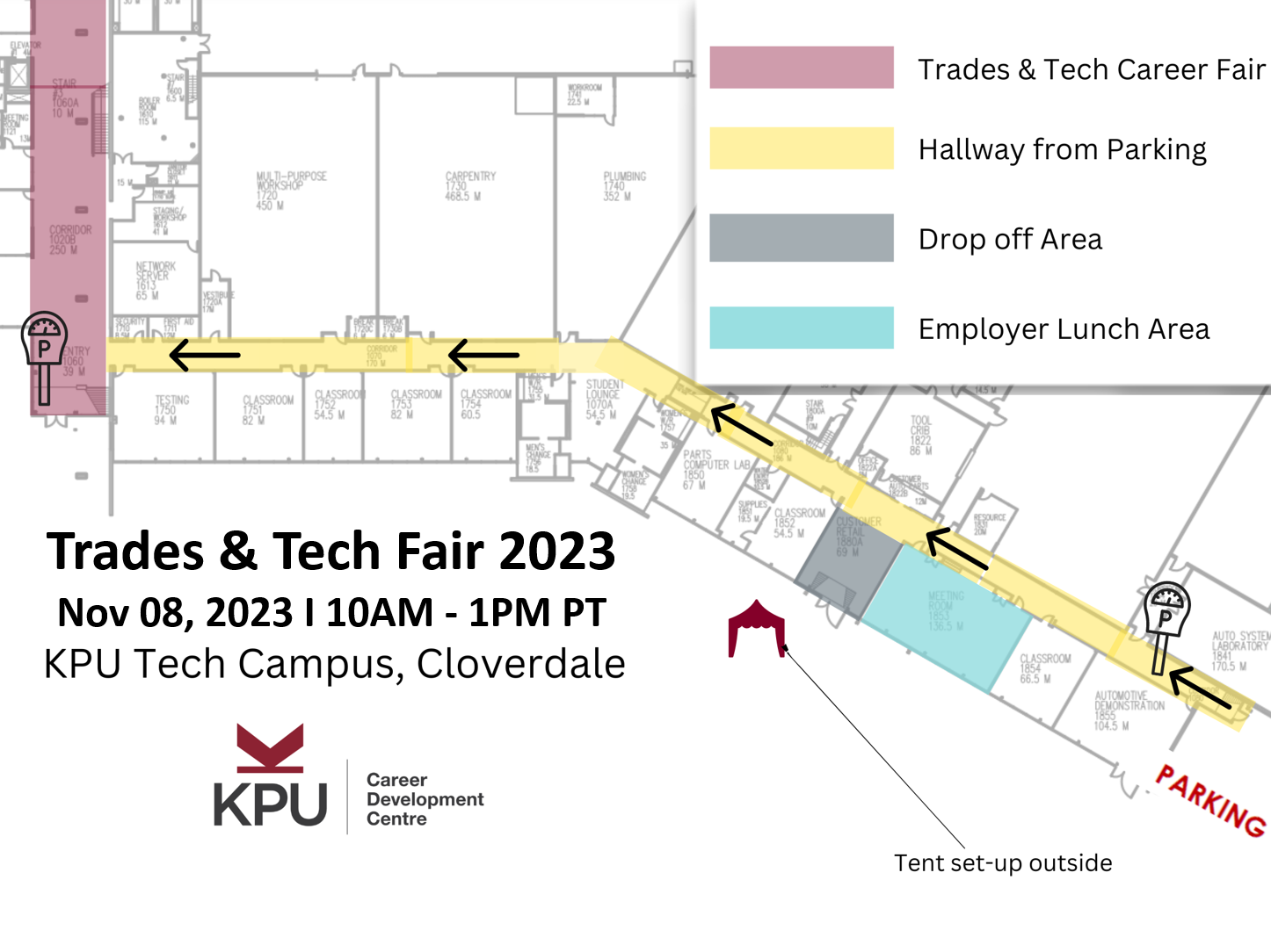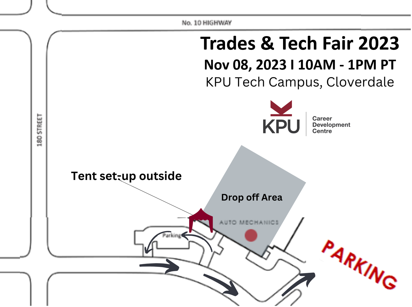 KPU Tech building’s address is 5500 - 180th Street. If you are arriving from 56th Avenue, please head south on 180th Street and go left behind the building to arrive at the parking lot. The southwest entrance near our auto mechanics classrooms is where you will register, we will have a tent set up outside of this entrance for visibility. Before parking, we recommend you drop off your banners and other materials when you register. We will ensure that all your stuff reaches the assigned booth while you park your vehicle.
