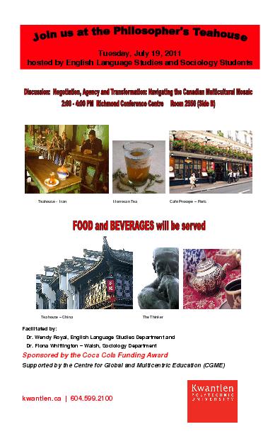 Out theme for the upcoming Teahouse is: Negotiation, Agency & Transformation: Navigating the Canadian Cultural Mosaic. This event is sponsored by a Coca Cola Funding Award and supported by the Centre for Global & Multicentric Education (CGME).