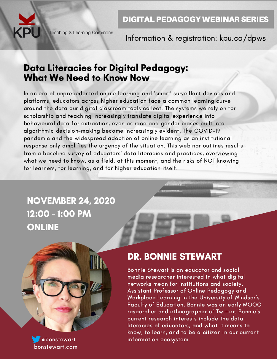 In an era of unprecedented online learning and ‘smart’ surveillant devices and platforms, educators across higher education face a common learning curve around the data our digital classroom tools collect. The systems we rely on for scholarship and teaching increasingly translate digital experience into behavioural data for extraction, even as race and gender biases built into algorithmic decision-making become increasingly evident. The COVID-19 pandemic and the widespread adoption of online learning as an institutional response only amplifies the urgency of the situation. This webinar outlines results from a baseline survey of educators' data literacies and practices, overviewing what we need to know, as a field, at this moment, and the risks of NOT knowing for learners, for learning, and for higher education itself.