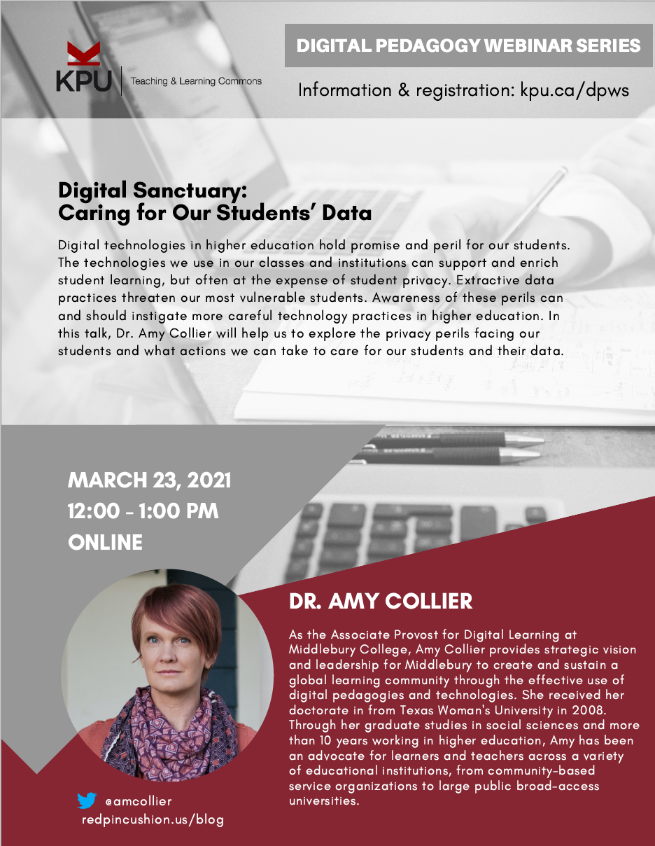 Digital technologies in higher education hold promise and peril for our students. The technologies we use in our classes and institutions can support and enrich student learning, but often at the expense of student privacy. Extractive data practices threaten our most vulnerable students. Awareness of these perils can and should instigate more careful technology practices in higher education. In this talk, Dr. Amy Collier will help us to explore the privacy perils facing our students and what actions we can take to care for our students and their data.