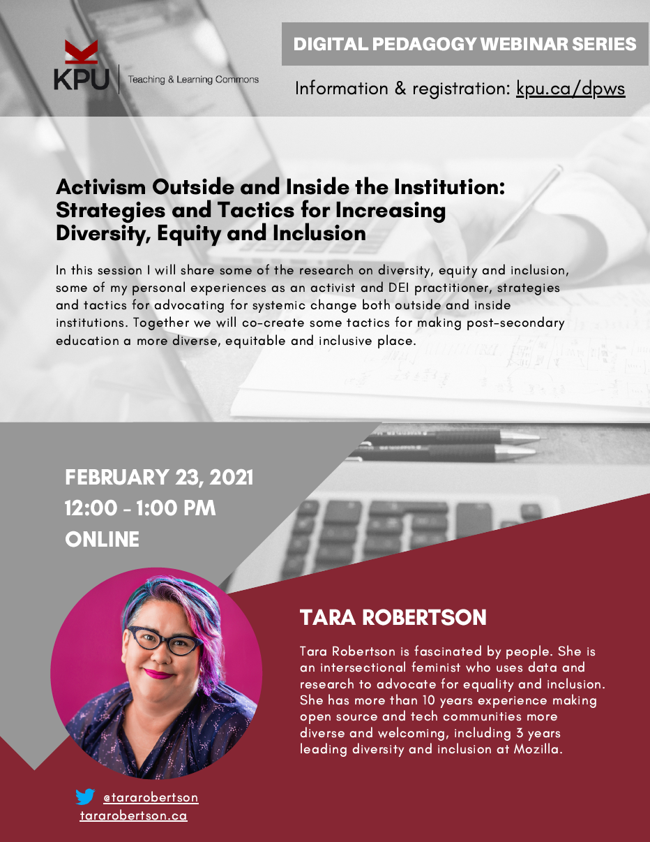 In this session I will share some of the research on diversity, equity and inclusion, some of my personal experiences as an activist and DEI practitioner, strategies and tactics for advocating for systemic change both outside and inside institutions. Together we will co-create some tactics for making post-secondary education a more diverse, equitable and inclusive place.