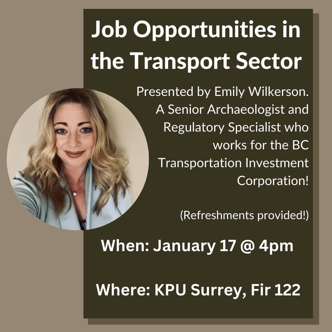 The KPU Anthropology Student Association is hosting a special guest speaker, Emily Wilkerson, who will be talking about job opportunities in the transport sector for archaeology students. The event will be held on the KPU Surrey Campus within Fir building, Room 122 at 4pm. Refreshments will be provided.