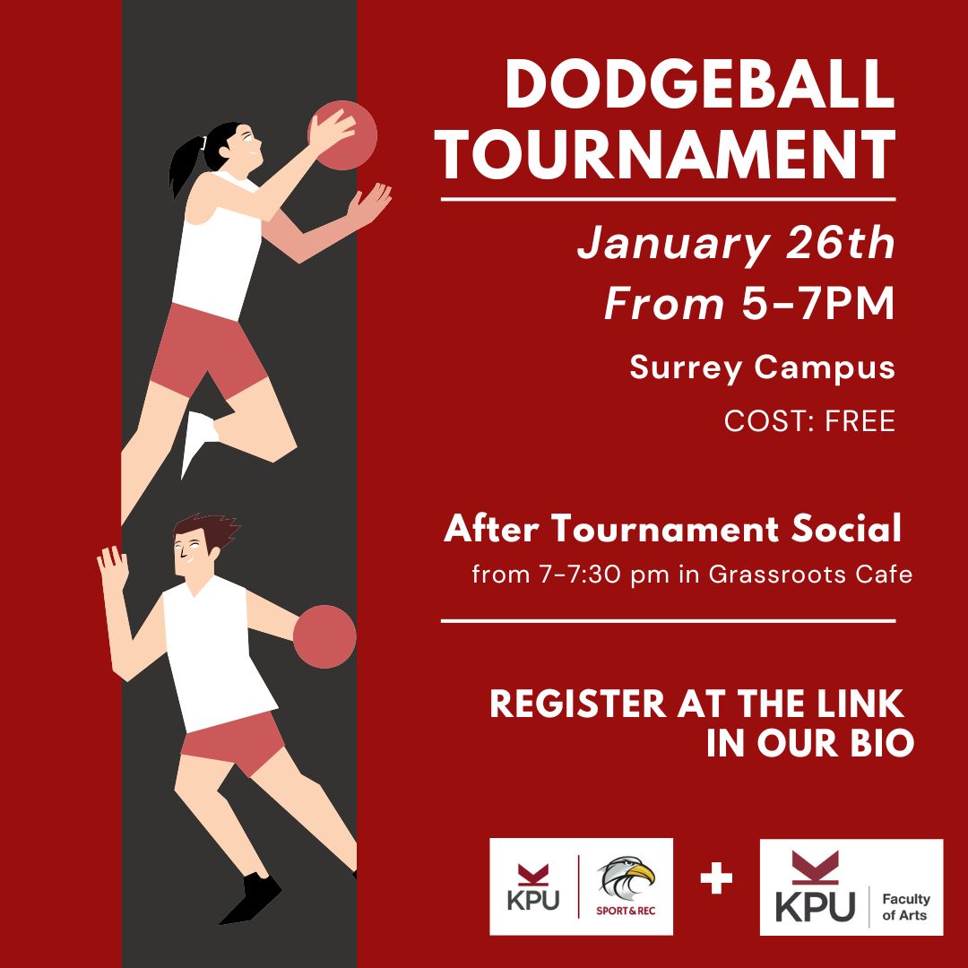 Join KPU Sports and Recreation and KPU Arts for a fun game of dodgeball and show off your competitive spirit! There will be prizes to be won and refreshments will be served.
