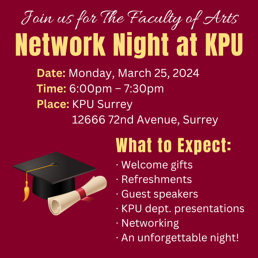 Join us for this fun-filled evening of celebration, connections and knowledge. We’ll have your favourite faculty members in attendance, as well as the Alumni department to tell you about the amazing perks you get by being a KPU grad. Career Service will be there to help you with any career related questions and to offer their services. In addition, we’ll have Arts Degree Advisors, financial aid staff, guest speakers and other notable departments there to fill you in on the latest and greatest happenings at KPU!