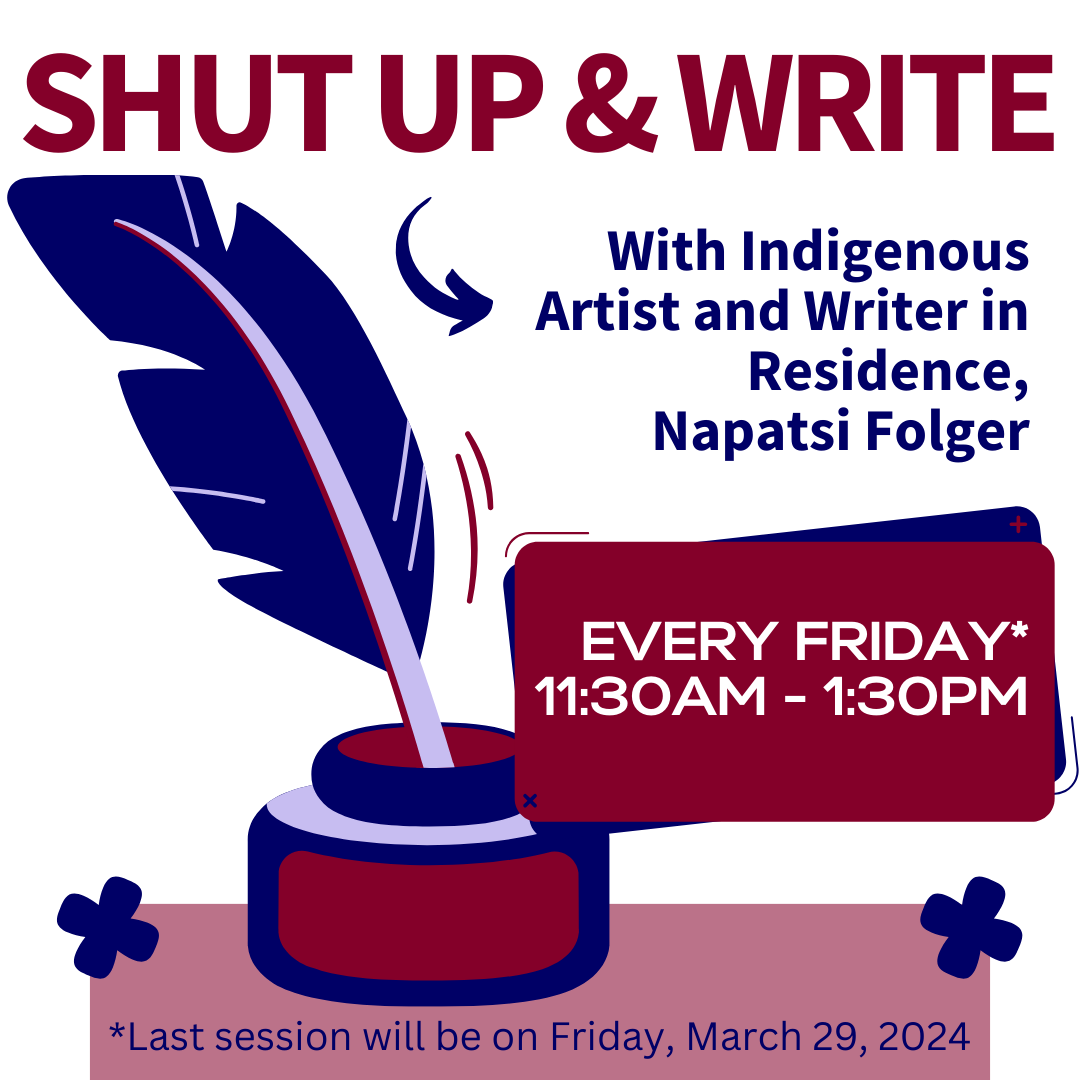 Bring your homework, poetry, screenplay or sketchbook and write together with Napatsi Folger, Indigenous Artist and Writer in Residence, and other folks who need a bit of community and motivation. Join us virtually or in person!