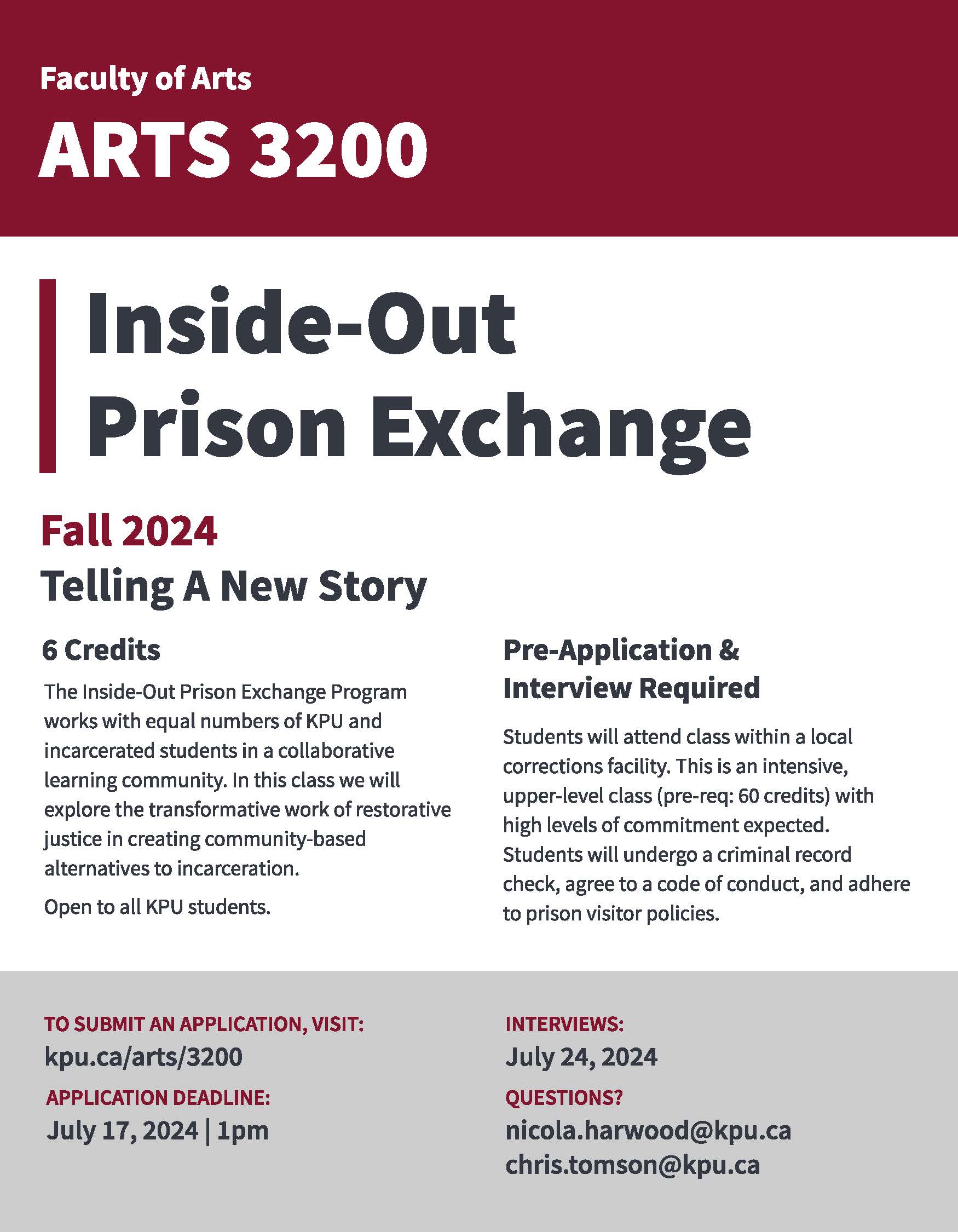 Based on an interdisciplinary model and offered once annually through the Faculty of Arts at KPU, this six-credit course is co-taught by a rotating selection of Inside-Out trained instructors emerging from various Arts disciplines including Criminology, Sociology, Creative Writing, Fine Arts, Music, Journalism and Communications and more. All KPU students with sixty credits or more are welcome to apply.