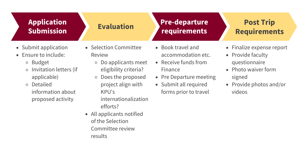 - Participation in international conferences that have a direct international educational focus. Note: Preference will be given to the applicants presenting at conferences highlighting KPU’s internationalization;