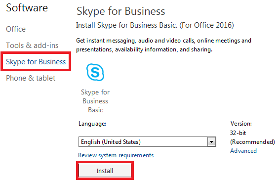 Note: Installing the complete Office 2016 package also installs Skype for Business along with Word, Excel, PowerPoint, OneNote, Access, Publisher, and OneDrive for Business. For more information, click here.