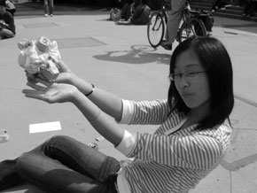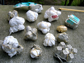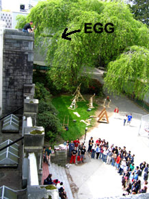 Using only an egg carton, a paper napkin, and four elastic bands, protect an egg from a four storey fall onto concrete. Smallest surviving design wins. Click here for the original rules.