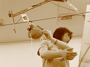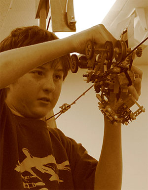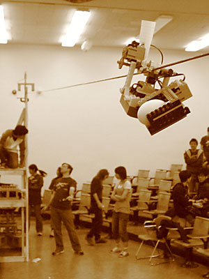 Build a device that will roll down a 12 metre clothes-line and drop an egg into a pool of water. Score was a combination of speed and egg dropping accuracy (contest rules here). This was a tough one! Only 1/3 of the teams managed to cross the finish line.