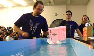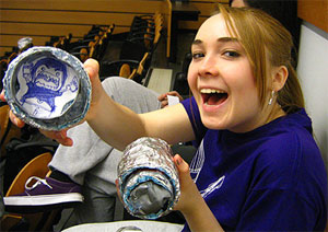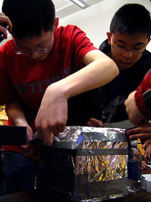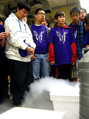 Egg Drop Extreme! Build a contraption that will protect an egg from a three storey fall onto concrete after being on a BBQ at 200 Celsius and a -200 Celsius Liquid Nitrogen bath (contest rules here). Templeton Secondary took the Gold with their featherweight design coming in at a mere 187 grams!