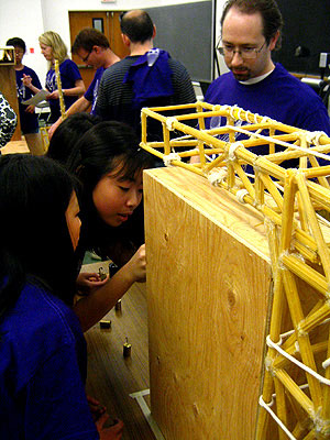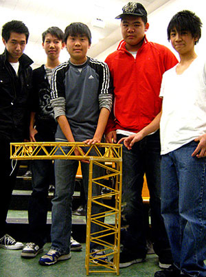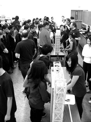 Build a tower crane out of spaghetti that holds as much weight as possible without touching an obstacle. Sounds simple, but the size restrictions made this a tough one (contest rules here). Eric Hamber students came out well ahead of the other teams with a design that held almost 4 times its own weight. Congratulations!