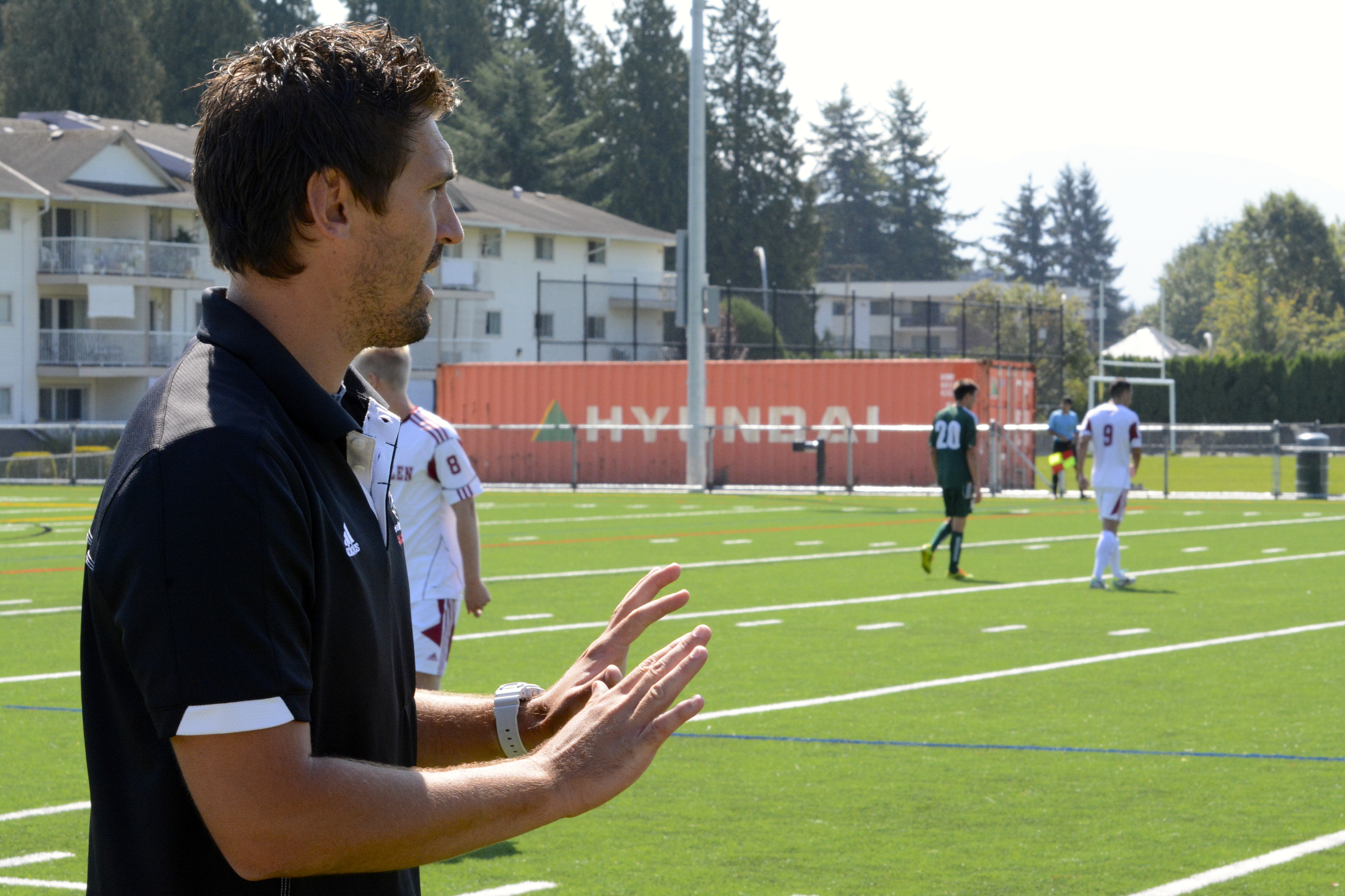 (Photo Credit: KPU Sports Information) KPU Head Coach Srdjan Djekanovic directs his team from the sidelines