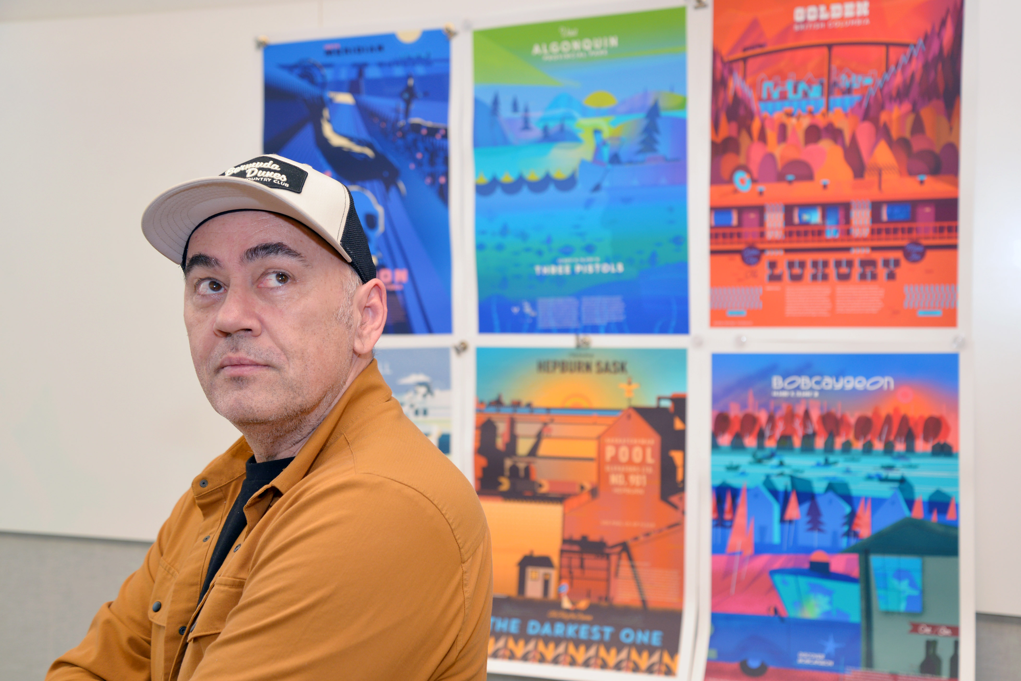 John Belisle, with partner Adam Rogers, designed eight travel posters featuring communities mentioned in the band’s songs. The pair came up with the idea after Mitchell Press tasked them to create something to spotlight the capabilities of its state-of-the-art Landa Printing Press.