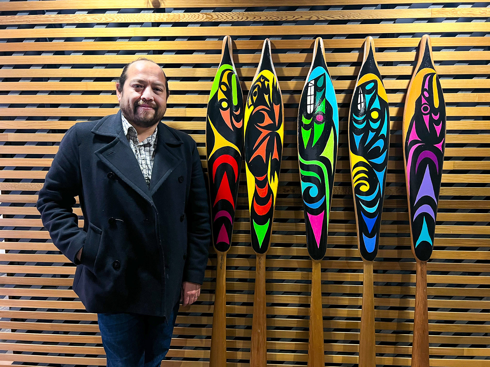 Each paddle is hand-carved and painted with an original Coast Salish design characterizing a KPU campus — a wolf for Surrey, a beaver for Tech, a bear for Civic Plaza, a thunderbird for Richmond and an eagle for Langley.