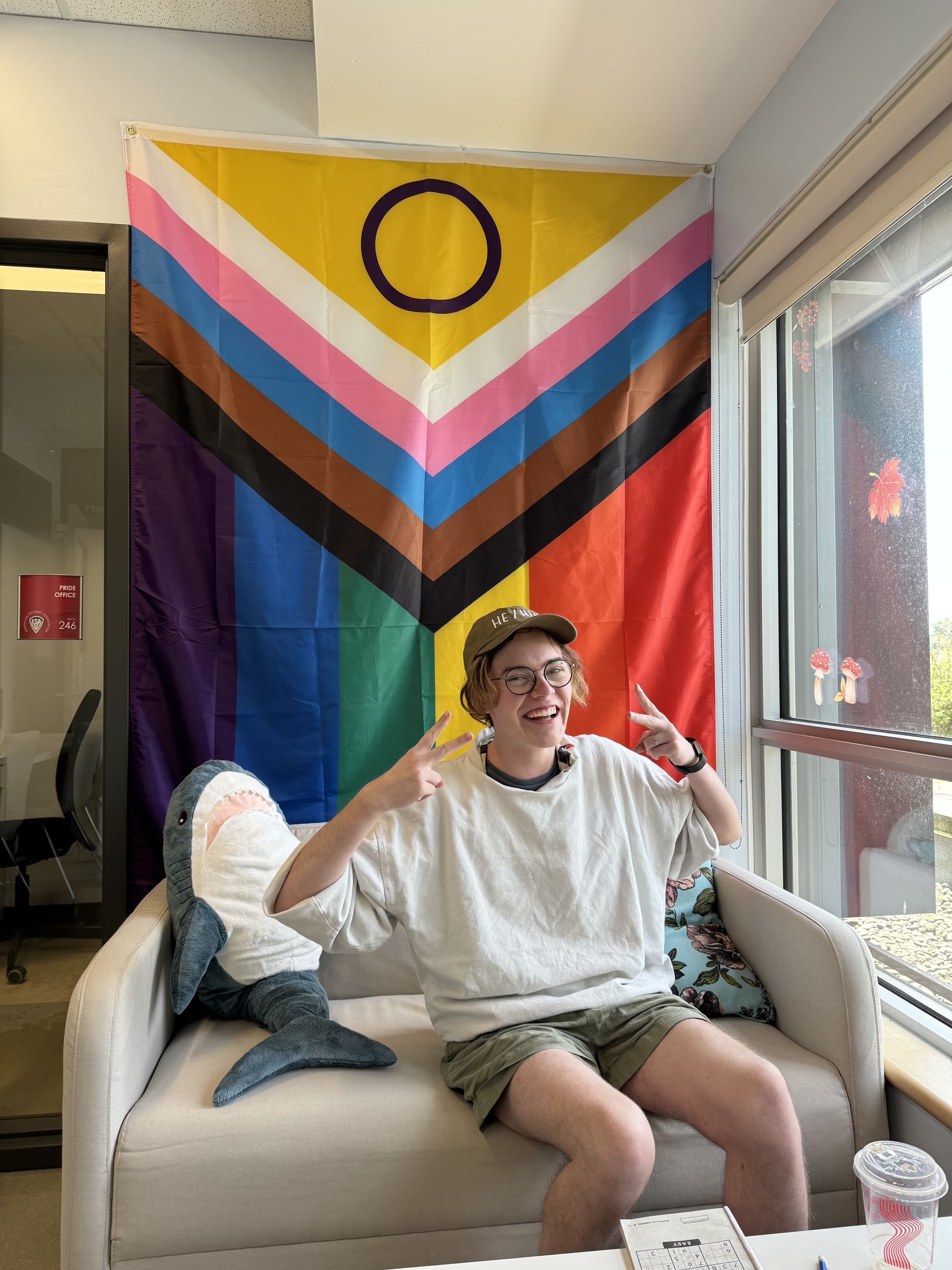 We encourage all 2SLGBTQIA+ students to visit the Pride Centre to chat, hang out with other students, or grab a snack. The space has books, educational pamphlets, safer sex supplies, and menstrual products.