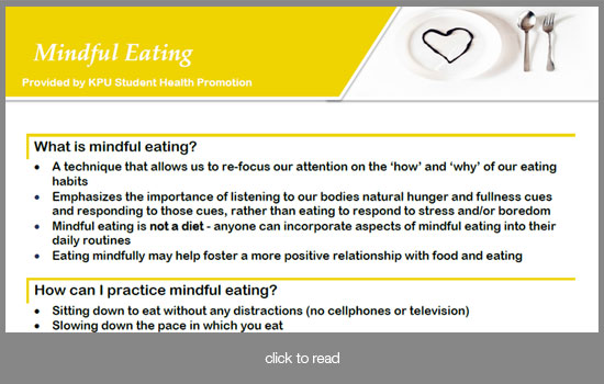 Research even shows that mindful eating may improve self-esteem, self-empowerment, and contribute to weight loss. Check out the following document created by Student Health Promotion that provides you with a brief introduction to mindful eating and a few helpful resources to learn more!