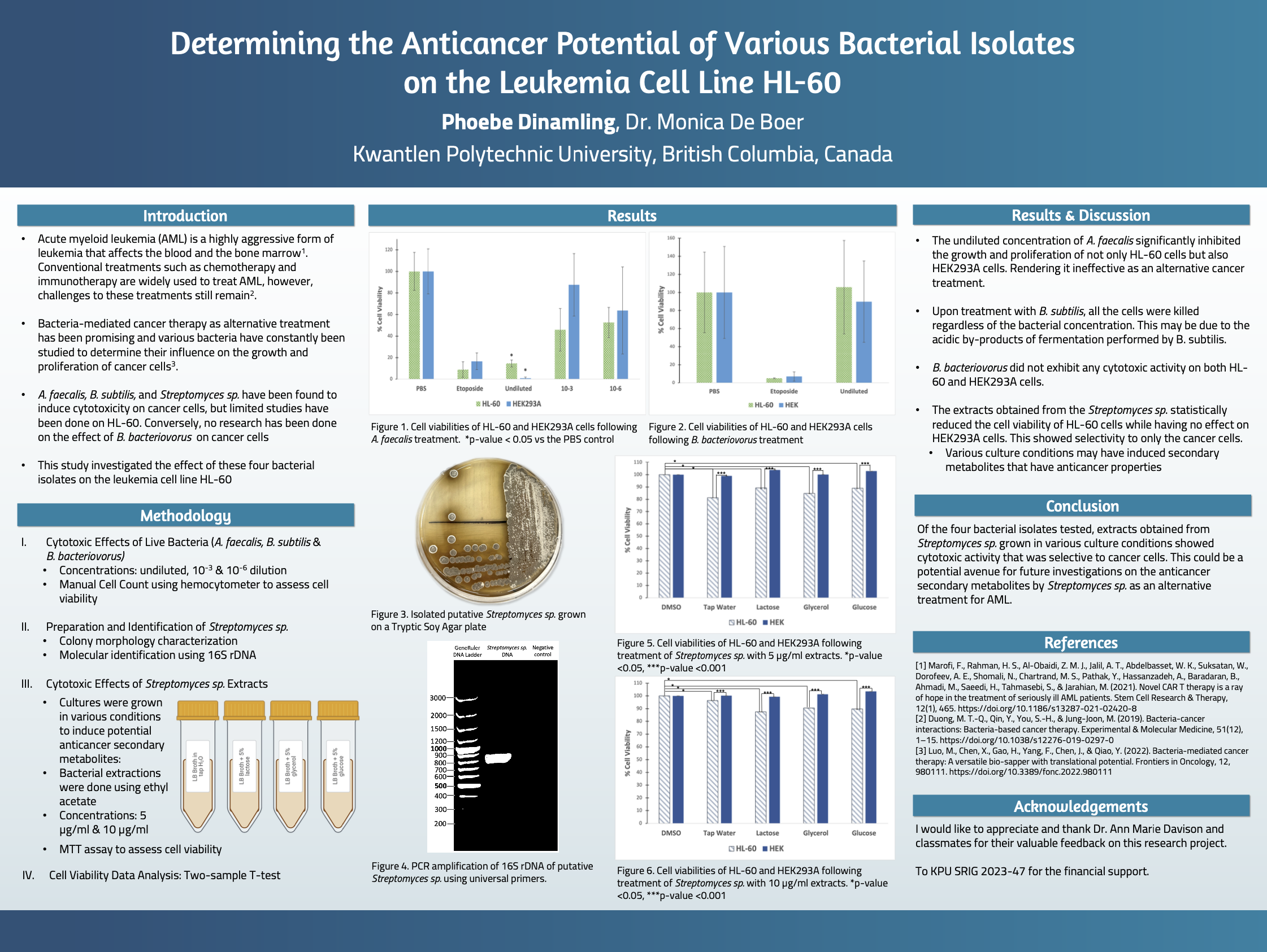 Conducting a research project during my final year of undergrad has been such a rewarding experience. Being able to examine the anticancer potential of various bacterial isolates in the Kwantlen Polytechnic University Biology Lab taught me more about the vast amount of research that remains to be done in the field of alternative cancer therapies. Throughout this project, I learnt to think critically and solve problems whenever I encountered a roadblock. In addition, I was able to apply and practice the theories I had studied throughout the previous four years. I'd like to thank Kwantlen Polytechnic University (KPU) and the Student and Research Innovation Grant (SRIG) for giving me the opportunity and financial support to work on this research project. I definitely encourage taking on a project. The experience you gain is worthwhile!